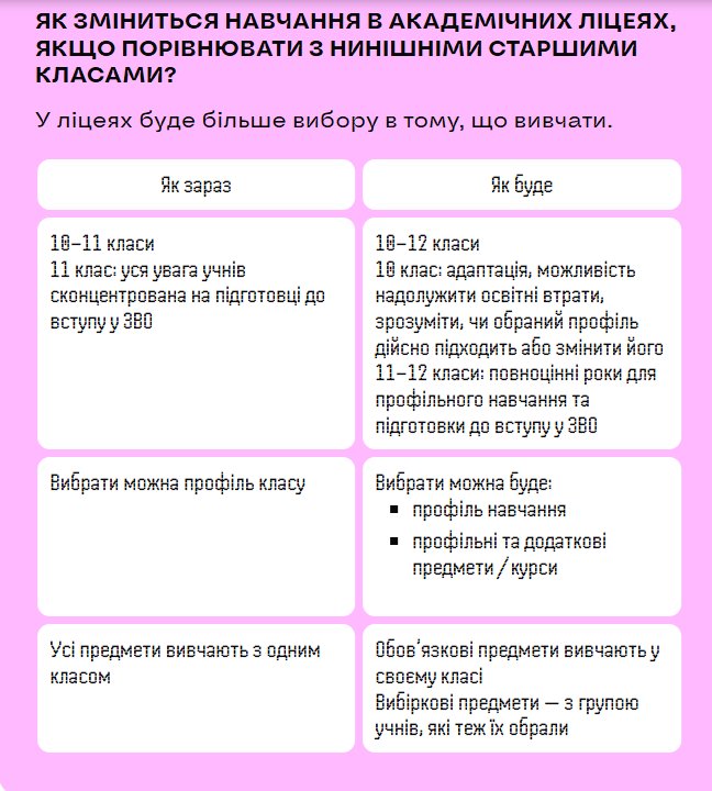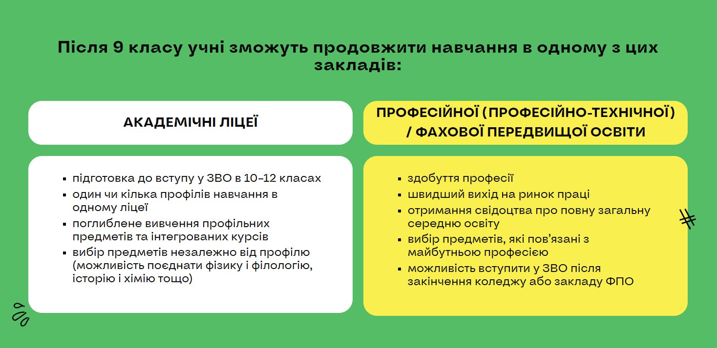 У нинішній моделі старшокласники вивчають багато дисциплін одночасно. З реформою дитина після 9 класу обиратиме профіль і матиме більше годин саме на предмети, які потрібні для вступу до вишу чи майбутньої професії.