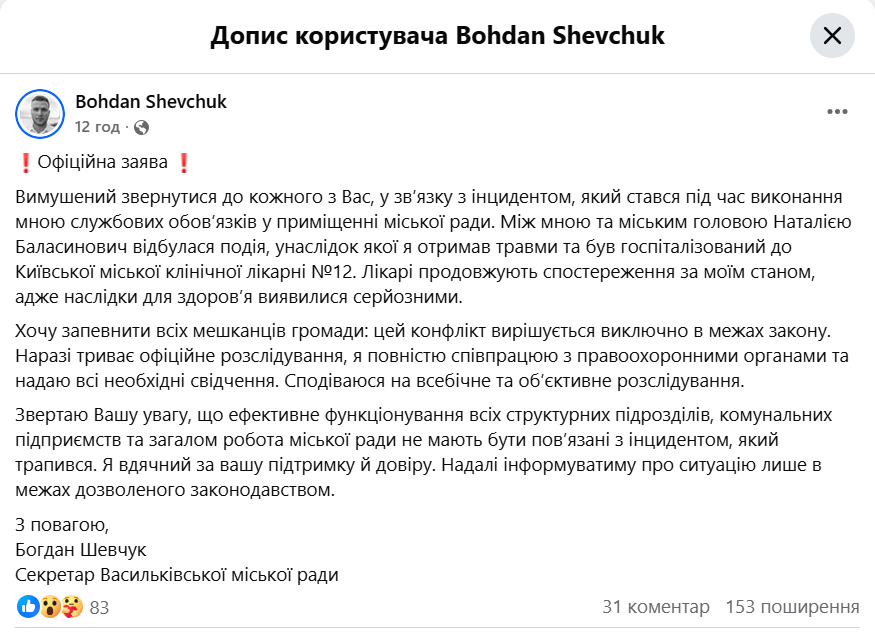 У Василькові Київської області секретар міської ради Богдан Шевчук заявив про завдання травм з боку очільниці міста Наталії Баласинович. Він зробив офіційну заяву через соцмережу "Фейсбук".