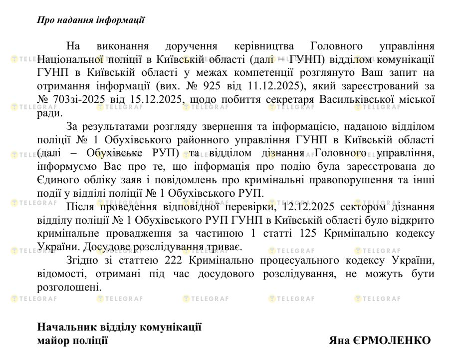 Оновлення: Поліція розпочала кримінальне провалдження. "Після проведення відповідної перевірки, 12.12.2025 сектором дізнання відділу поліції № 1 Обухівського РУП ГУНП в Київській області було відкрито кримінальне провадження за частиною 1 статті 125 Кримінально кодексу України. Досудове розслідування триває", — зазначено у відповідь на запит "Телеграфа".