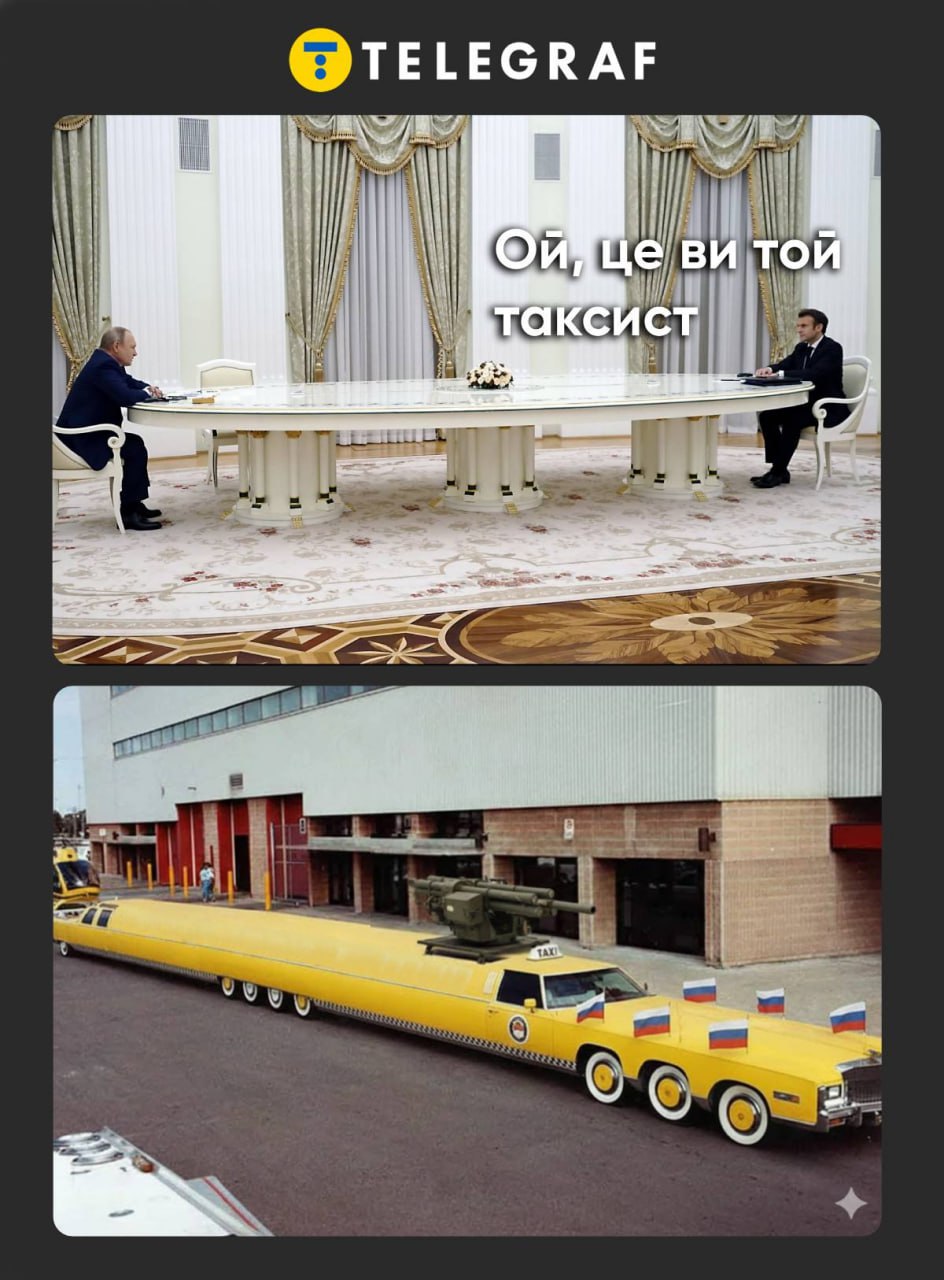 У центрі жартів — і образ "таксиста 90-х", і уявні розмови з клієнтами, і фантазії про те, як могла виглядати машина таксі президента. Згадали і про довжезний стіл, за яким Путін свого часу приймав президента Франції Еммануеля Макрона в лютому 2022 року.