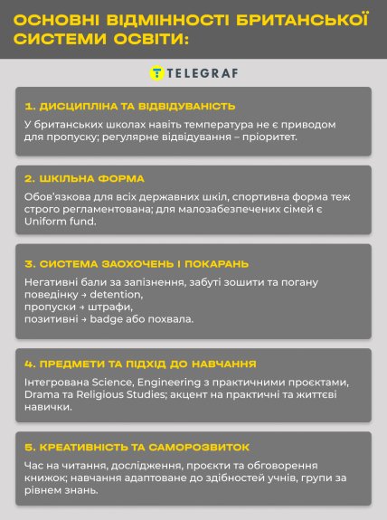 Загалом у британських школах серйозно ставляться до дотримання дисципліни, говорить в розмові з "Телеграфом" українка Анастасія, що живе в Британії з двома синами. За запізнення, невиконане домашнє завдання чи забутий зошит або бейджик – роблять зауваження, а потім можуть й покарати.