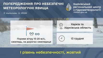 У Харкові та Харківській області у суботу, 13 грудня, прогнозують небезпечні погодні умови. Синоптики попереджають про сильні пориви вітру та ожеледь, яка утвориться у нічний час. На дорогах очікується ожеледиця, що може ускладнити рух транспорту.