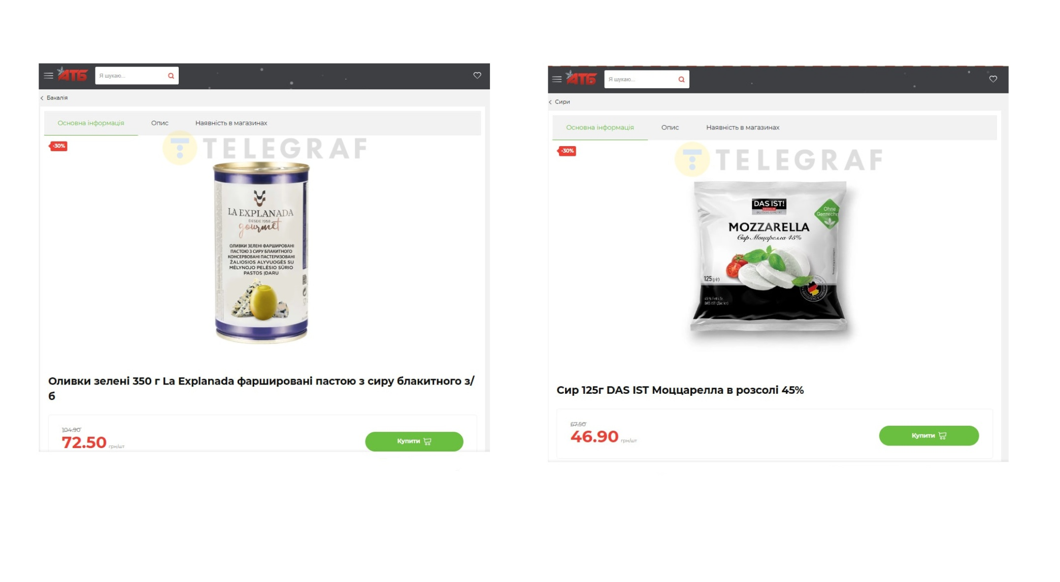Серед інших пропозицій — оливки зелені La Explanada (350 грамів), фаршировані сиром блакитного кольору, за 72,50 гривень (-30%) і моцарела DAS IST (125 грамів) за 46,90 гривень (-30%).