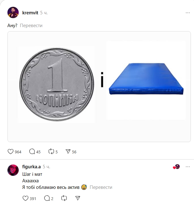 Один з користувачів запропонував ребус. Зобразивши на малюнку 1 копійку, букву "і" та зображення гімнастичного мату, він запропонував розгадати його значення. Відповідь була надана майже миттєво.