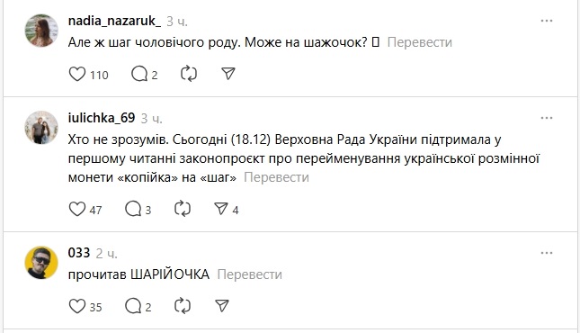 У четвер, 18 грудня, народні обранці підтримали в першому читанні законопроєкт про перейменування української розмінної монети "копійка" на "шаг". Українці з гумором та іронією відреагували на такі ініціативи.