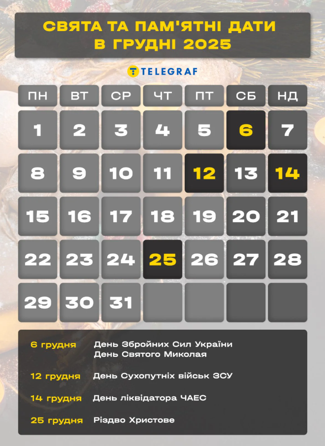 Календар свят на грудень 2025 року