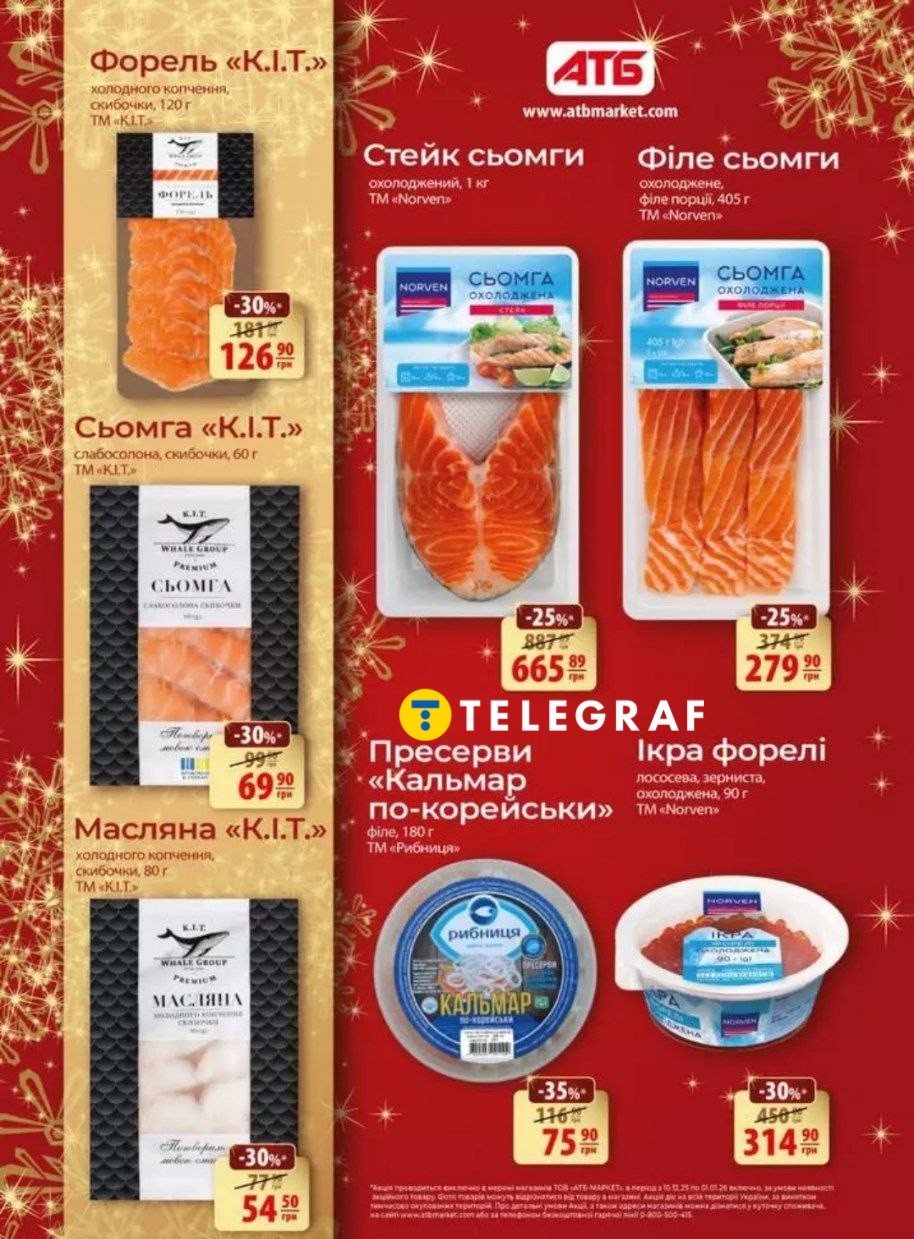 Перед зимовими святами в "АТБ" оновили знижки на рибні продукти, які часто купують до святкового столу. Частина пропозицій діє обмежений час і стосується товарів, що зазвичай коштують недешево.