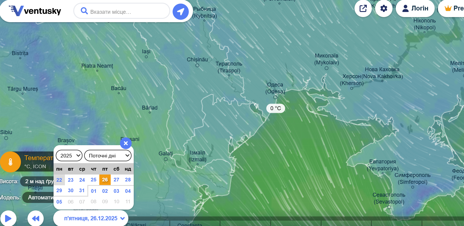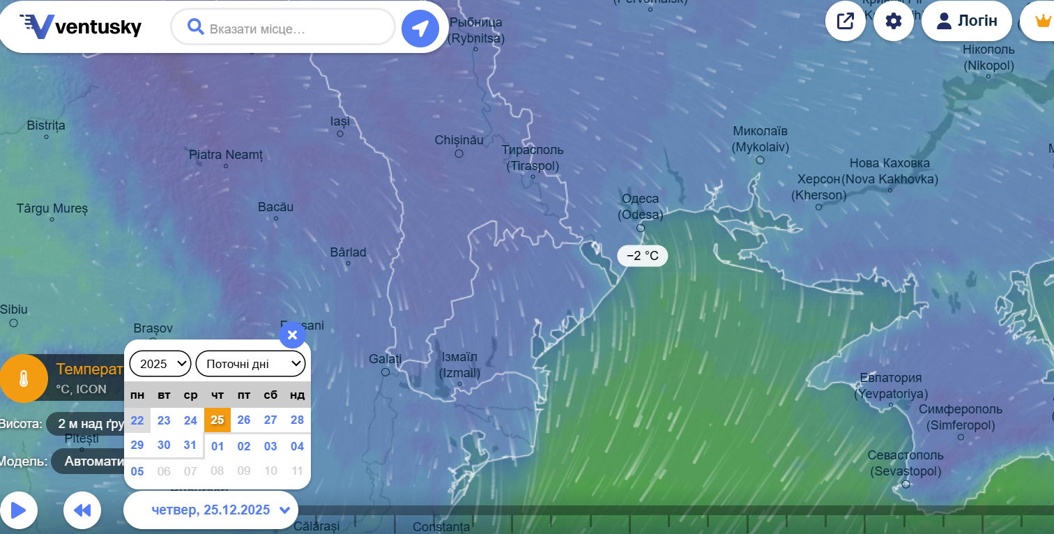 Увечері 24 грудня, на Святвечір, температура повітря в Одесі опуститься приблизно до –1 °C. За даними Ventusky, опади не прогнозуються — ані снігу, ані дощу. Погода буде сухою, з характерною для півдня України зимовою прохолодою без різких перепадів.