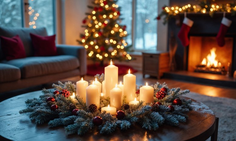 Постеліть гарну скатертину, акуратно накрийте стіл, розставте свічки, повісьте гірлянди та поставте у вазу гілки ялини чи сосни.