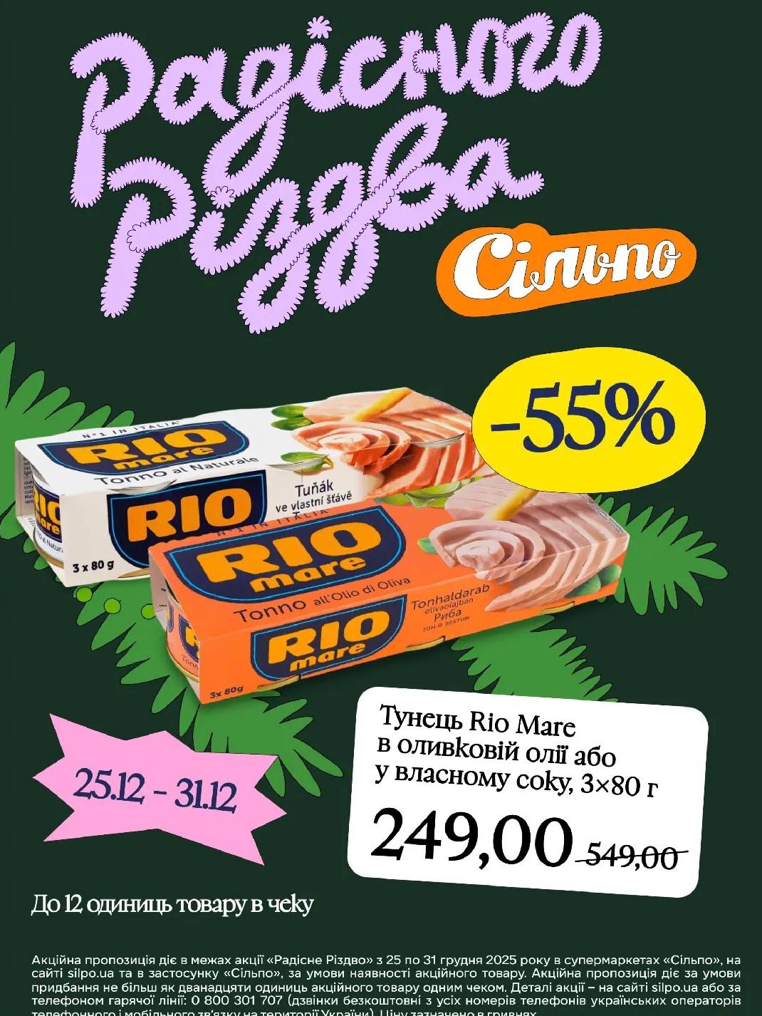 Тунець Rio Mare у власному соку або в оливковій олії (3 банки по 80 грамів) зараз коштує 249,0 гривень замість 549,0 гривень — економія 300 гривень.