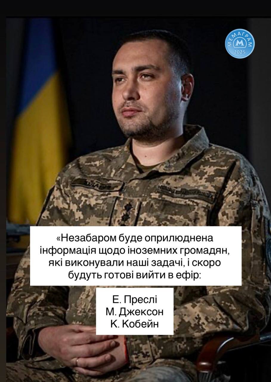 На іншому мемі головний український розвідник каже: "Незабаром буде оприлюднена інформація щодо іноземних громадян, які виконували наші задачі, і скоро будуть готові вийти в ефір". Далі він перелічує прізвища покійних американських зірок: Елвіса Преслі, Майкла Джексона та Курта Кобейна.