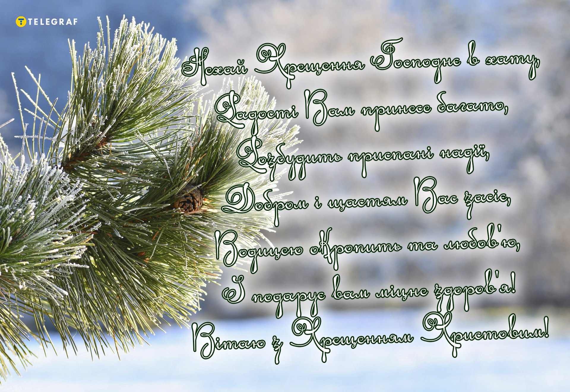 Вітаю з Водохрещем! Нехай цей день принесе до твоєї хати справжній затишок, спокій та душевне тепло. Бажаю, щоб на серці завжди було світло, а всі тривоги пішли разом із освяченою водою.