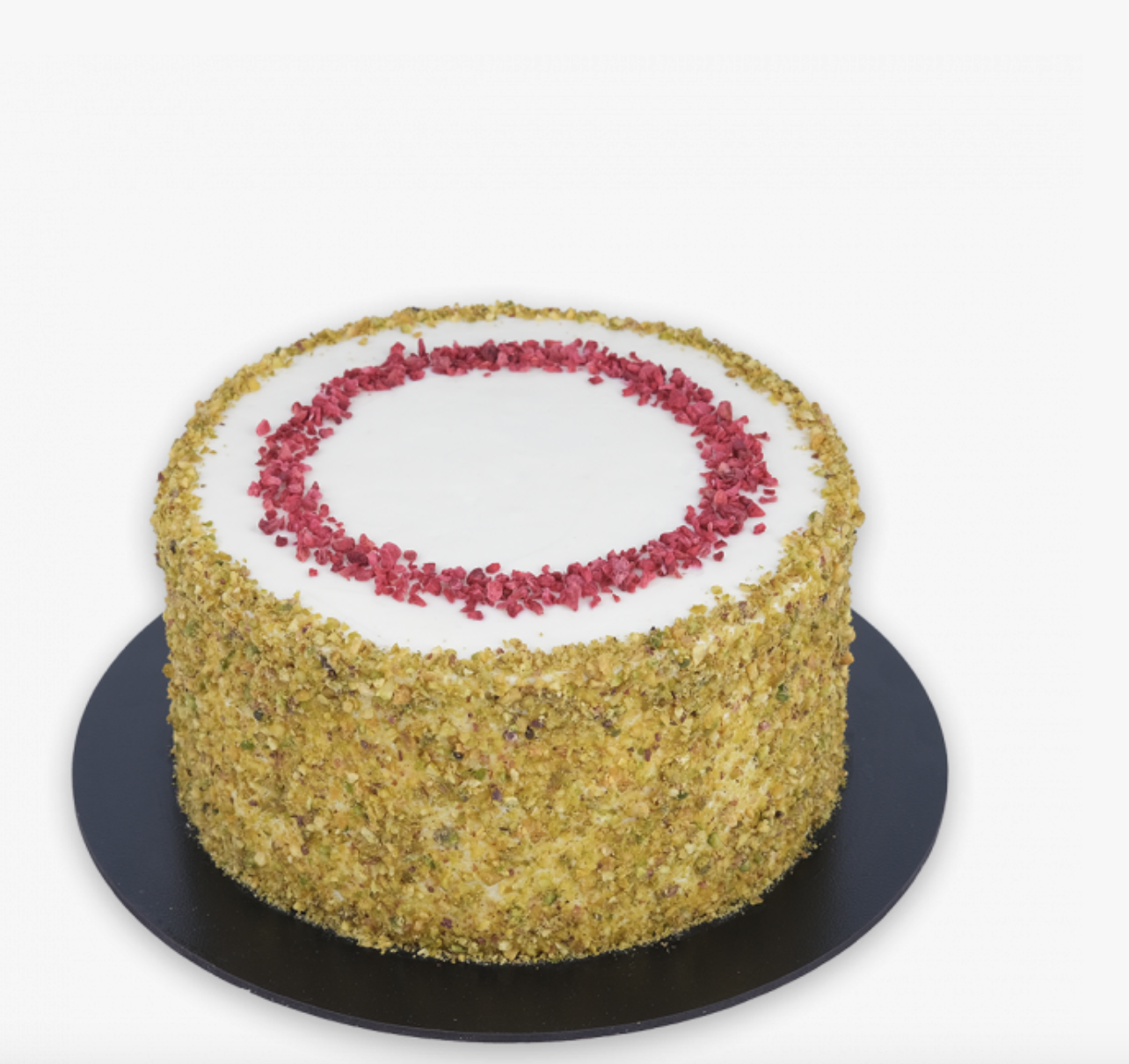 Як видно на фото, торт складається з бісквітних фісташкових коржів з горішками, крем чізу на основі маскарпоне та начинки. А саме фісташкове шанті (збити вершки з цукром) з білим шоколадом та згущеним молоком. Бортики торта прикрашені подрібненими фісташками, а верхівка — сублімованою малиною.