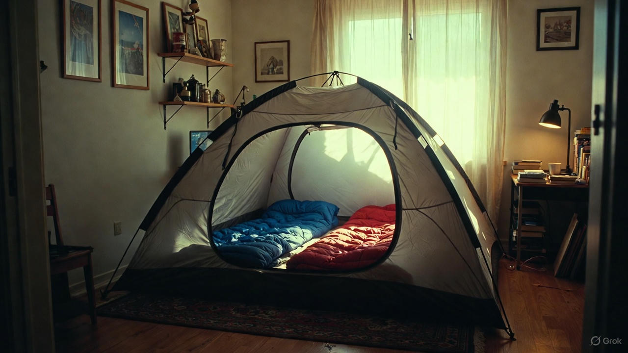 Вони радять купити додому похідний намет та спальні мішки. Звичайно ж і тут знадобиться термобілизна. Просто встановіть намет посеред кімнати, принесіть усередину всілякі ковдри та подушки, щоб зробити якомога комфортнішим перебування в цьому наметі. А на ніч можна укутатися в спальні мішки, які точно не дадуть вам замерзнути.