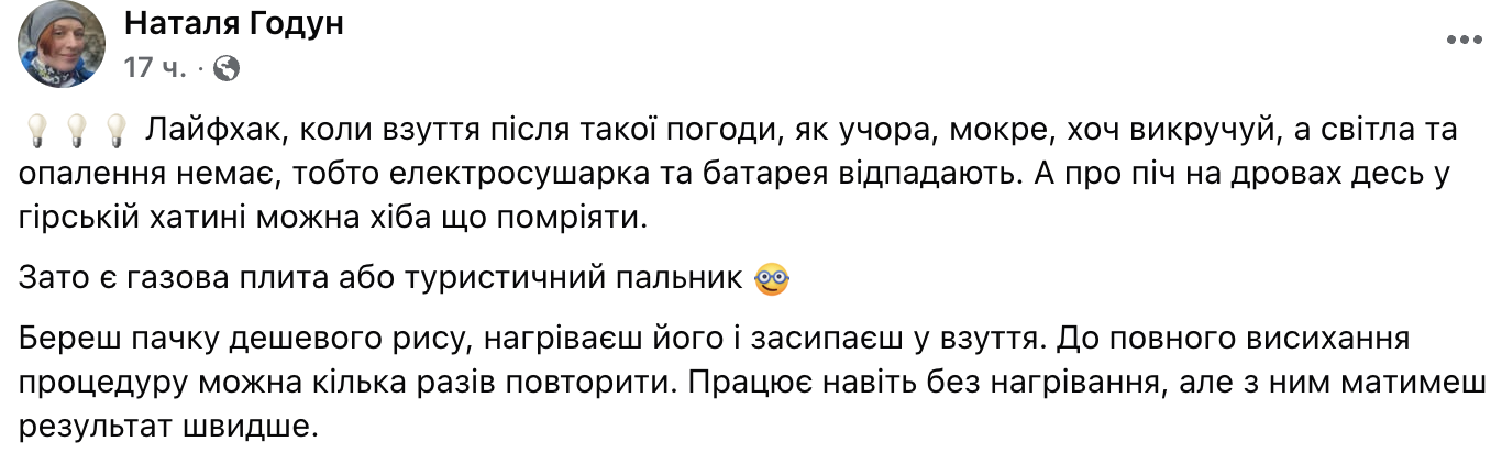 Користувачка каже, що під час сильних дощів чи снігопадів часто приходиш додому з мокрим взуттям. А останнім часом відключення світла не дають змогу використати електросушарку чи батареї. Та і не усе взуття можна сушити на батареях.