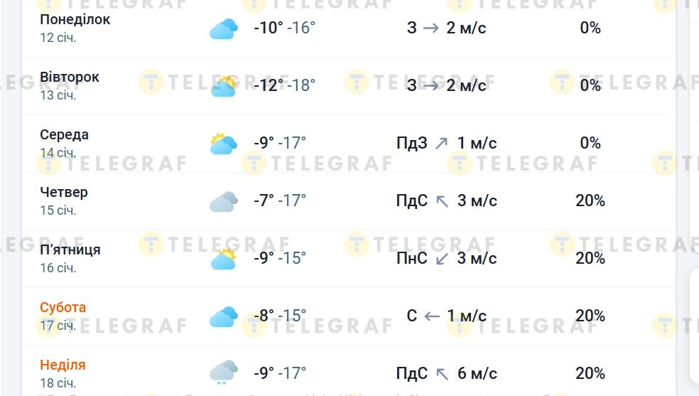 Початок тижня буде холодним і сухим. 12 січня вдень буде близько -10 °C, вночі до -16 °C, погода хмарна, вітер слабкий. Наступного дня мороз посилиться: вдень -12 °C, вночі до -18 °C, хмарно з проясненнями, опадів не прогнозується.