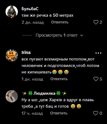 "Та зараз така погода дощі так що хороший транспорт на зиму". "Ну, а шо, цеж Харків а раптом у плавь треба, а тут бац і готовий". "Всі лякають всесвітнім потопом, ось чоловічок і підготувався, щоб потім не кипішувати", — пишуть в коментарях.
