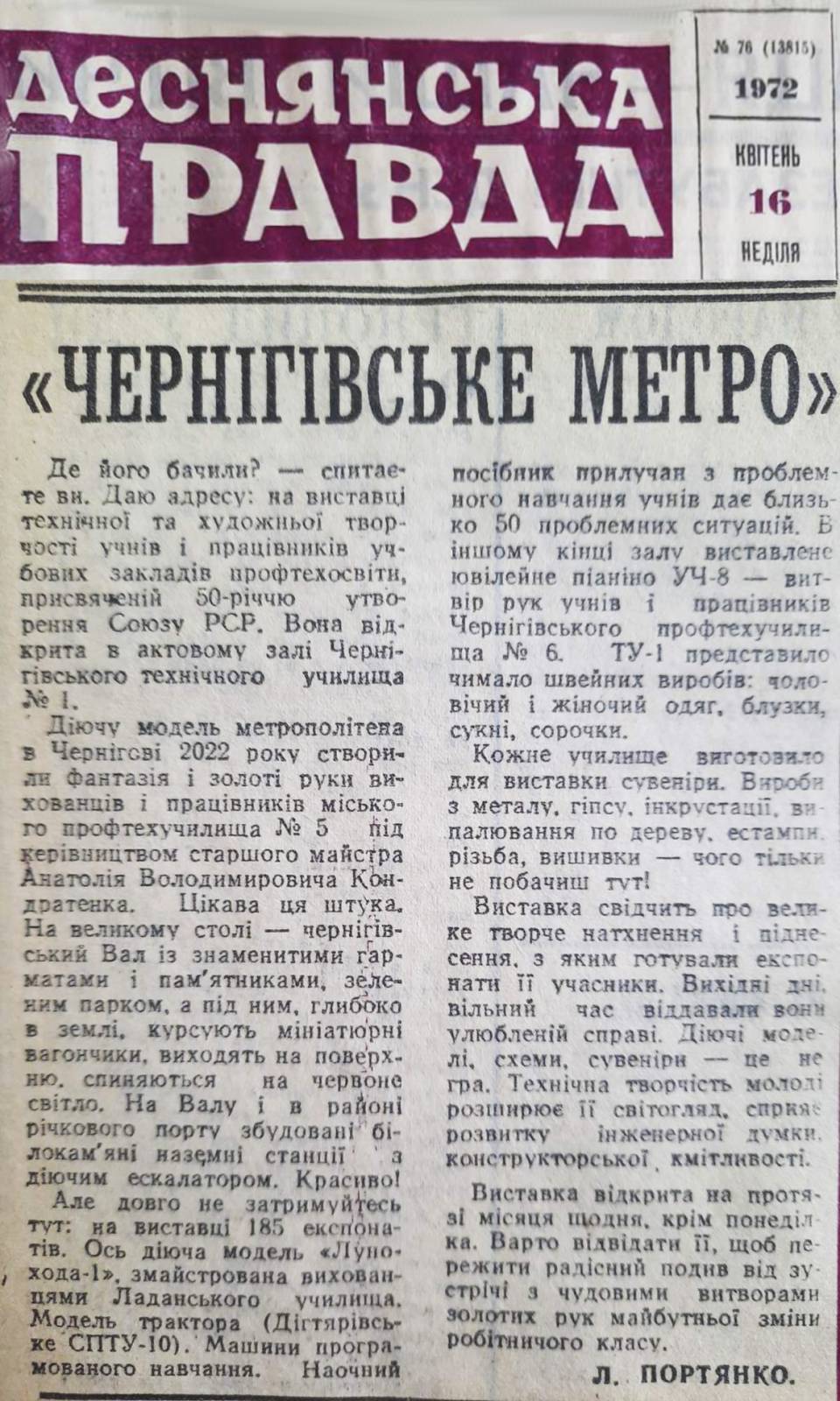 Стаття про "Чернігівське метро" у Деснянській правді за 1972 рік