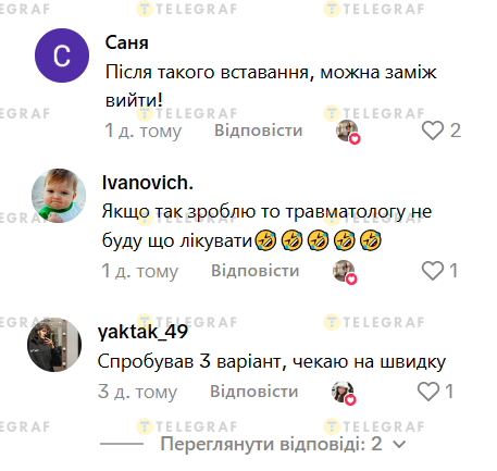 Тисячі людей уподобали подібний спосіб підйому. Здебільшого пишуть, що це дуже круто, але "після такого вставання, можна заміж вийти". Частина коментаторів наголосила, що способи піднятись не менш травматичні, за саме падіння. "Якщо так зроблю, то травматологу не буде що лікувати", "Спробував 3 варіант, чекаю на швидку", — жартують коментатори.