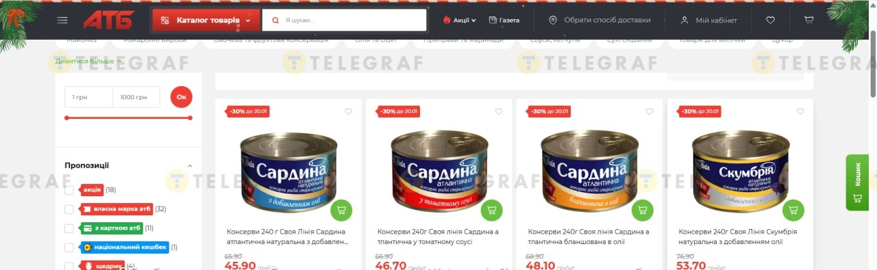 Серед пропозицій акції є сардина атлантична натуральна з олією від ТМ "Своя лінія" вагою 240 грамів. Зараз її можна купити за 45,90 гривень, що на 20 гривень дешевше від звичайної ціни. Також за зниженою ціною доступна сардина в томатному соусі того ж виробника — тепер 46,70 гривень замість 66,90 гривень. Сардина бланшована в олії також подешевшала: 48,10 гривень замість 68,90 гривень.