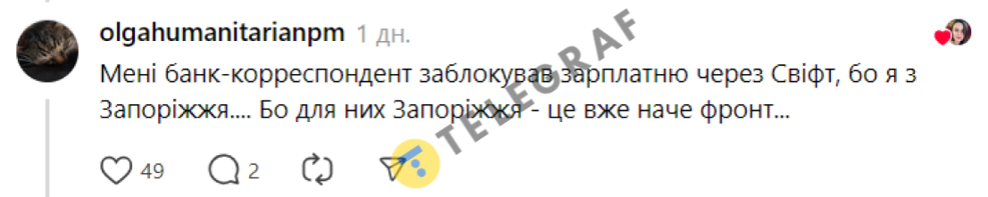 Користувачі скаржаться, що банки та фінансові сервіси блокують перекази через SWIFT. Відкриття рахунків у таких компаніях, як Genome, Wise та Interactive Brokers, теж стає проблемою. Деякі люди змушені звертатися до міськради за офіційним підтвердженням, що Запоріжжя залишається Україною.