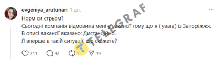 Сьогодні компанія відмовила мені у вакансії тому, що я (увага) із Запоріжжя. В описі вакансії було чітко вказано – дистанційно. Я вперше в такій ситуації,