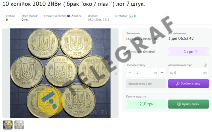 На спеціалізованому сайті продають лот із семи монет 10 копійок 2010 року з браком "око". Стартова ціна становить 1 гривню, а ціна "Купити зараз" встановлена на рівні 210 гривень. Монети не піддавалися чищенню або реставрації, уточнює власник.