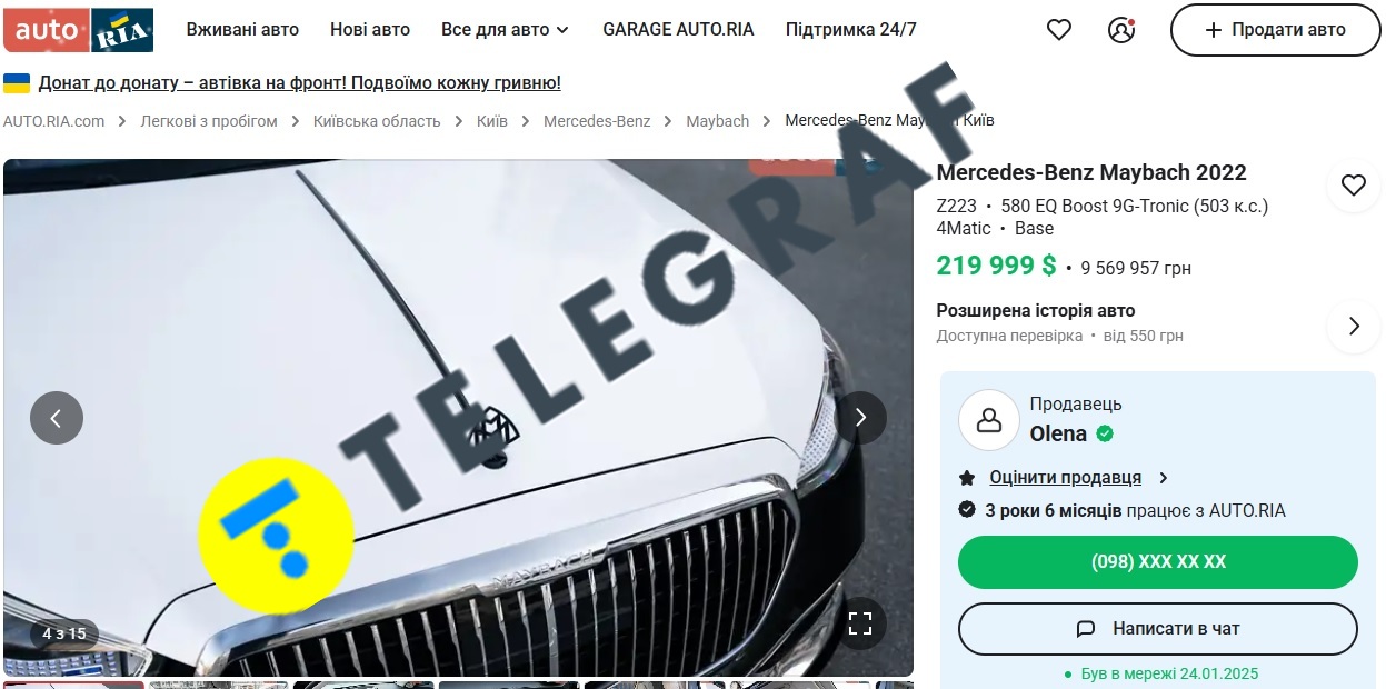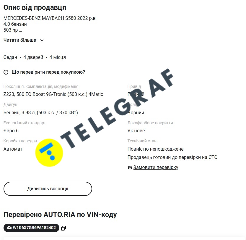 Мерседес Майбах, за нашими даними, був куплений у листопаді 2022 року новим, а зараз продається за 220 тисяч доларів (понад 9 мільйонів гривень).