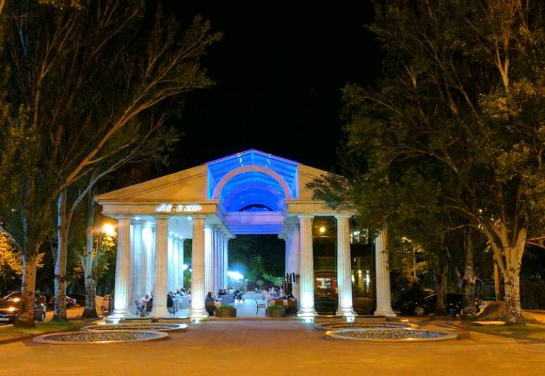 Виконаний він у давногрецькому стилі з колонадами. З одного боку колони засклені — саме там і знаходився ресторан, з іншого – є вільний прохід. Тут у теплий період літній майданчик. Перед рестораном з боку проспекту невеликий фонтан.