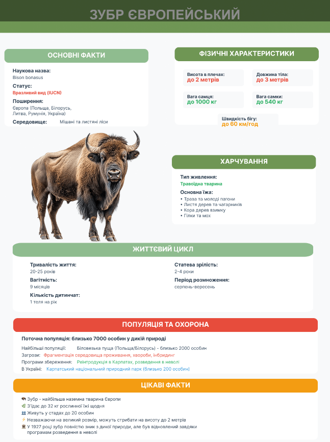 Довідка. Європейський зубр — найбільша дика тварина Європи та найважча сухопутна тварина на континенті. Доросла особина може важити від 400 до 900 кілограмів, а висота в холці сягає 2 метрів. Самці зазвичай більші за самиць.