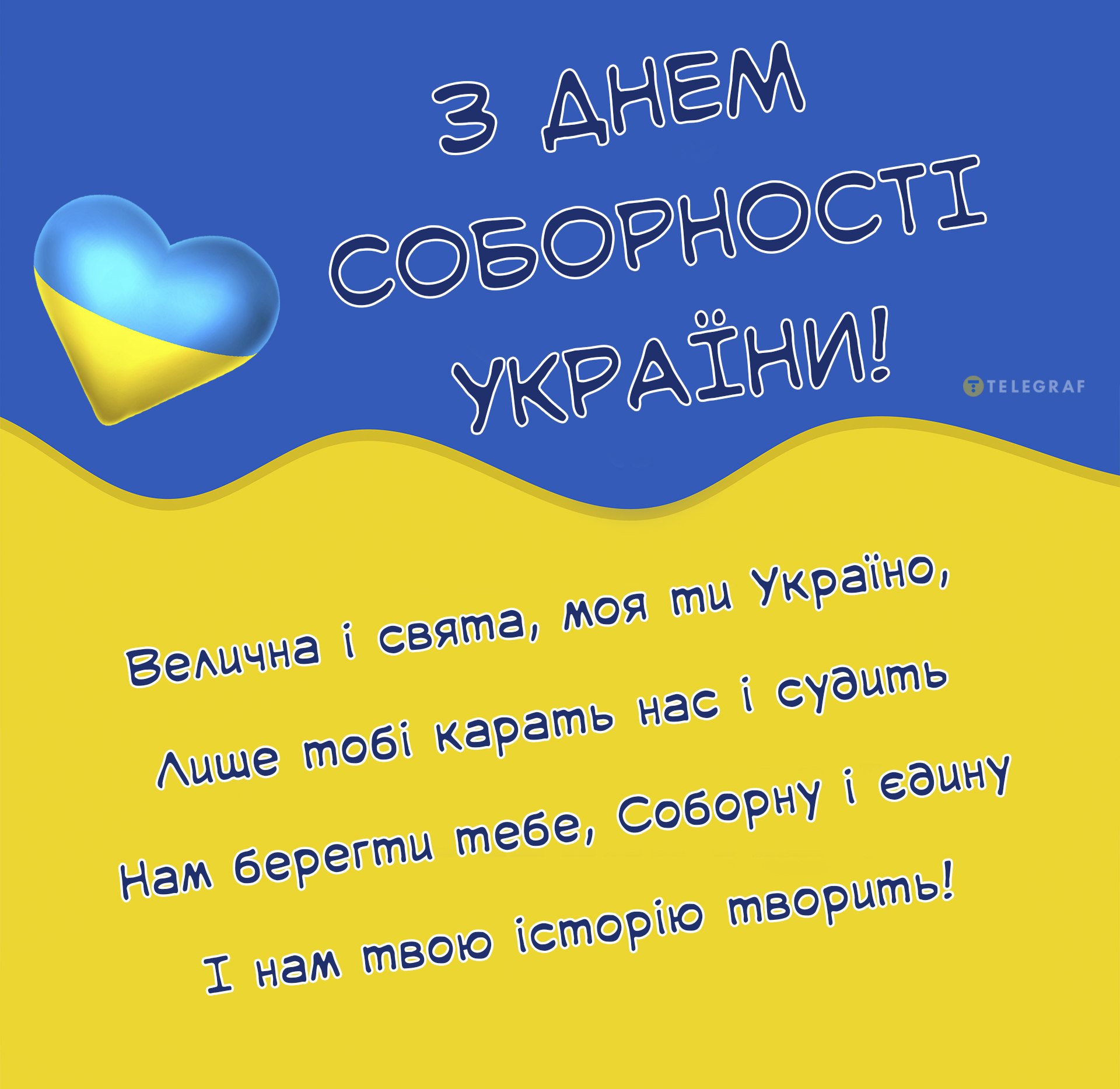 "Телеграф" підготував добірку яскравих листівок і картинок до Дня Соборності України 2026. Оберіть вподобану картинку, завантажте її на свій пристрій і надішліть рідним та друзям або поділіться на своїх сторінках у соцмережах.
