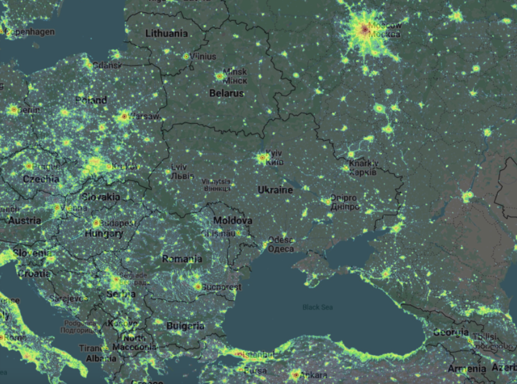 Фактично тут відстежують забрудненість середовища та штучне світло, тому досить добре видно те, як освітлюються країни. Показовими є не тільки Москва чи Берлін, а й інші великі міста, а також портові регіони. Вони буквально спалахують на знімках.