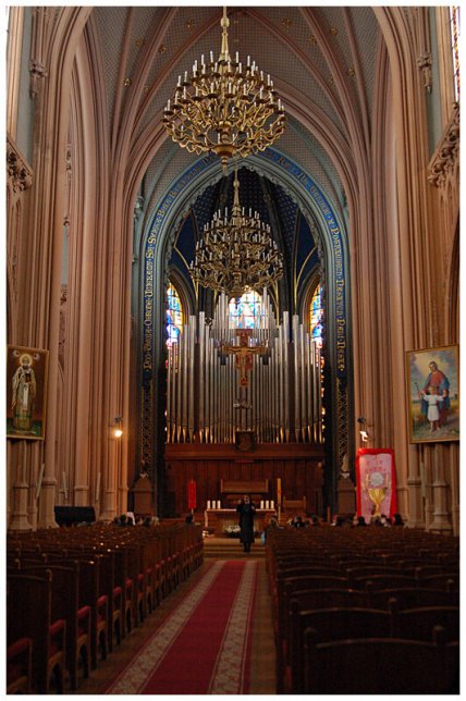 Особливо вражає величезне вітражне вікно-троянда над центральним входом — характерна риса готичних соборів. Інтер'єр храму вміщував близько трьох тисяч віруючих і був оздоблений вітражами роботи німецьких та польських майстрів.