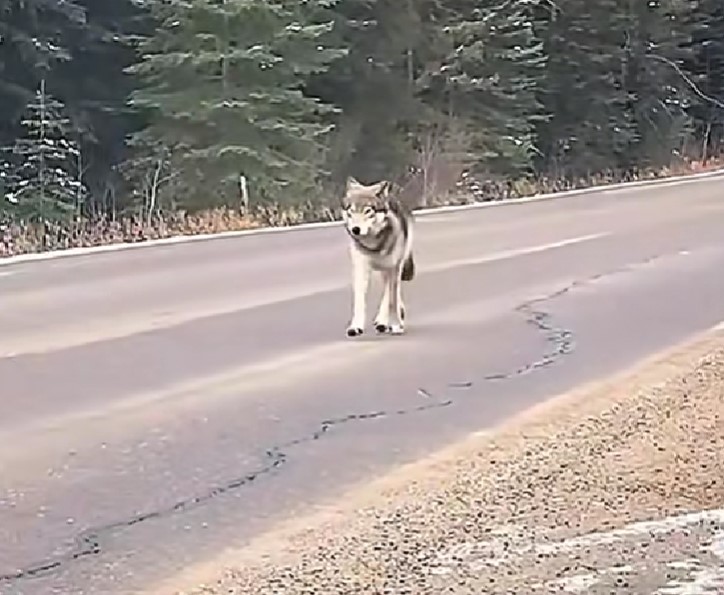 На кадрах, знятих з середини автомобіля, зафільмований незвичний "пішохід". Вовк спокійно біг собі порожньою трасою назустріч автомобілю, якого анітрохи не злякався.