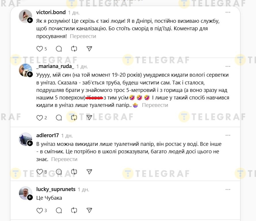 Дехто поділився способом, який, на його думку, може відучити людей кидати серветки в унітаз, але такий підхід може мати негативні наслідки. Також користувачі писали, що такі базові речі варто пояснювати ще у школі, щоб уникати засмічення каналізації.