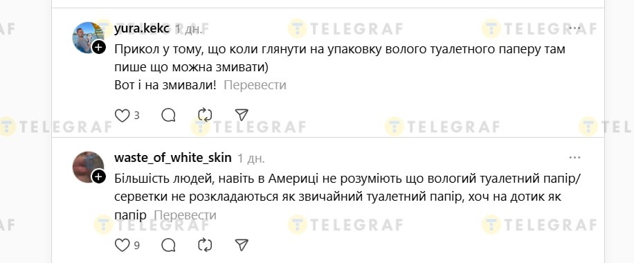 У коментарях під дописом користувачі зазначили, що багато людей змивають вологі серветки, бо на упаковках вказано, що їх можна не викидати і що вони нібито розчиняються у воді.