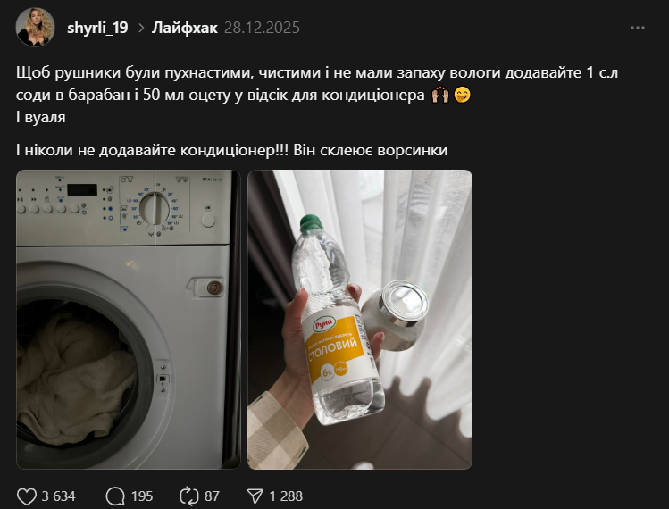 При цьому автор підкреслює, що використовувати кондиціонер для білизни при пранні рушників не рекомендується. Вона пояснила це тим, що засіб буквально склеює ворсинки, тому рушники втрачають пухнастість і гірше вбирають вологу.