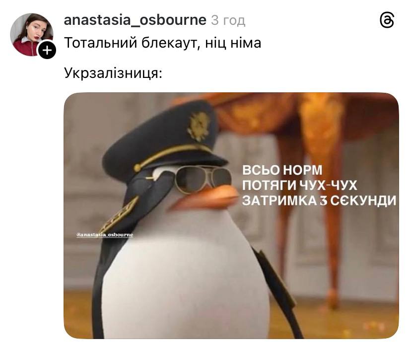 Згадали в мемах і "Укрзалізницю", яка попри регулярні обстріли, відключення та сильні морози продовжує працювати. Щоправда, іноді стаються затримки рейсів.