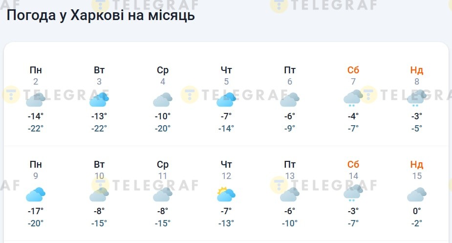 У Харкові на початку лютого очікується стійка зимова погода з двома періодами сильних морозів. Перший із них припадає на період з 2 по 6 лютого, а другий — з 9 по 13 лютого.