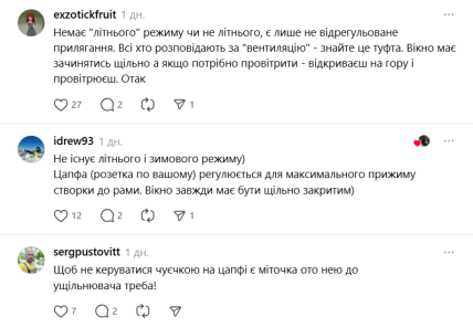 За словами жінки, вікна треба перевести з літнього у зимовий режим. Однак у коментарях їй пояснили, що немає "літнього" режиму, є лише не відрегульоване прилягання. Після регулювання вікно тримає тепло значно краще.