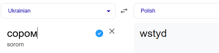 Сьогодні українське "сором", як і "ганьба" має прямий переклад на польську – wstyd. Це більше нагадує російський "стыд". Однак у мові наших західних сусідів збереглося слово srom, яке перекладається як "вульва".