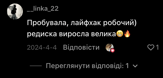 • Пробувала, лайфхак робочий. Редиска виросла велика.