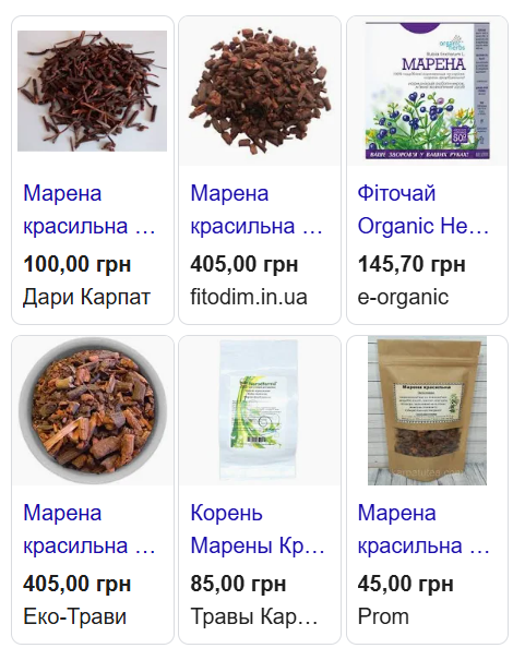 В Україні корінь Марени красильної можна купити в сухому вигляді в аптеках та інтернеті. Вартість варіюється в залежності від грамажу.