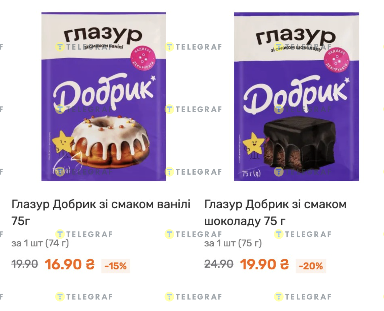 • глазур "Добрик" з агар-агаром зі смаком лимона жовта 100 г — 31,99, зі смаком ванілі — 37,19 грн,