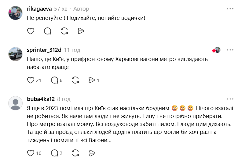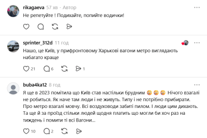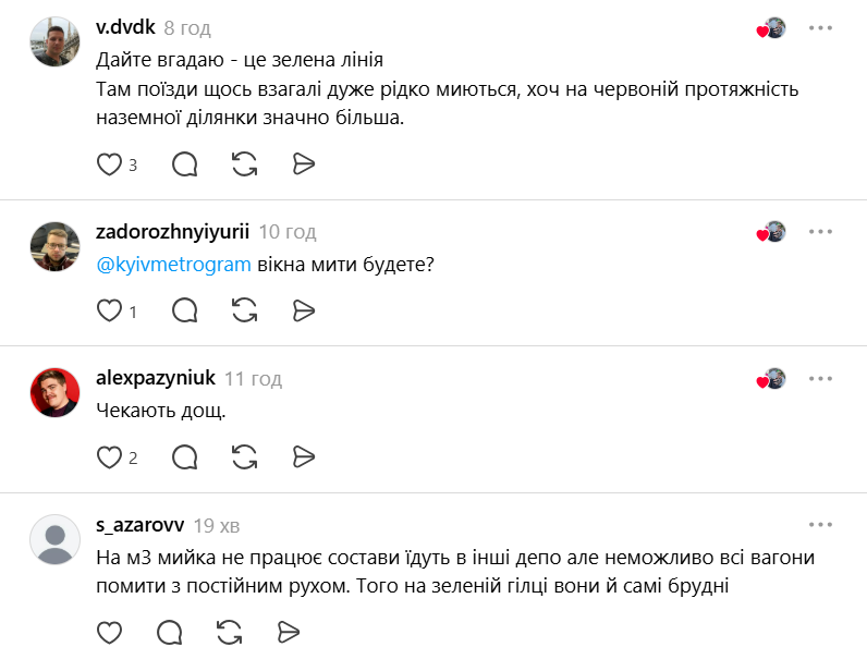 Під публікацією чимало коментарів. Дехто жартує, що у метрополітені чекають на дощ, який помиє вікна. Хтось пише, що їх помиють у Чистий четвер. Один з коментаторів припустив, що це — Зелена лінія, адже там, пише він, поїзди миються дуже рідко.