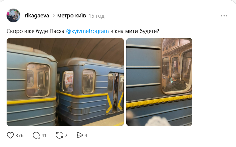 Брудні вікна вагонів київської підземки показала користувачка соцмережі Тhreads. Вона іронізує, що скоро Великдень, час помити вікна. Як відомо, українські господині обов'язково роблять це перед святом Христового Воскресіння.