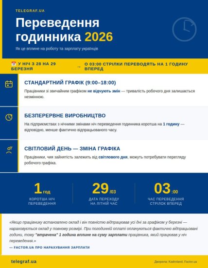 Про це пише видання Kadroland. Журналісти нагадують, що працівники зі стандартним графіком роботи (зокрема, з 9:00 до 18:00) "не відчувають" переведення годинників. Адже тривалість роботи у такому разі жодним чином не зміниться. Однак на підприємствах з безперервним виробництвом нічна зміна з 28 на 29 березня зменшує кількість робочих годин на 1 годину.