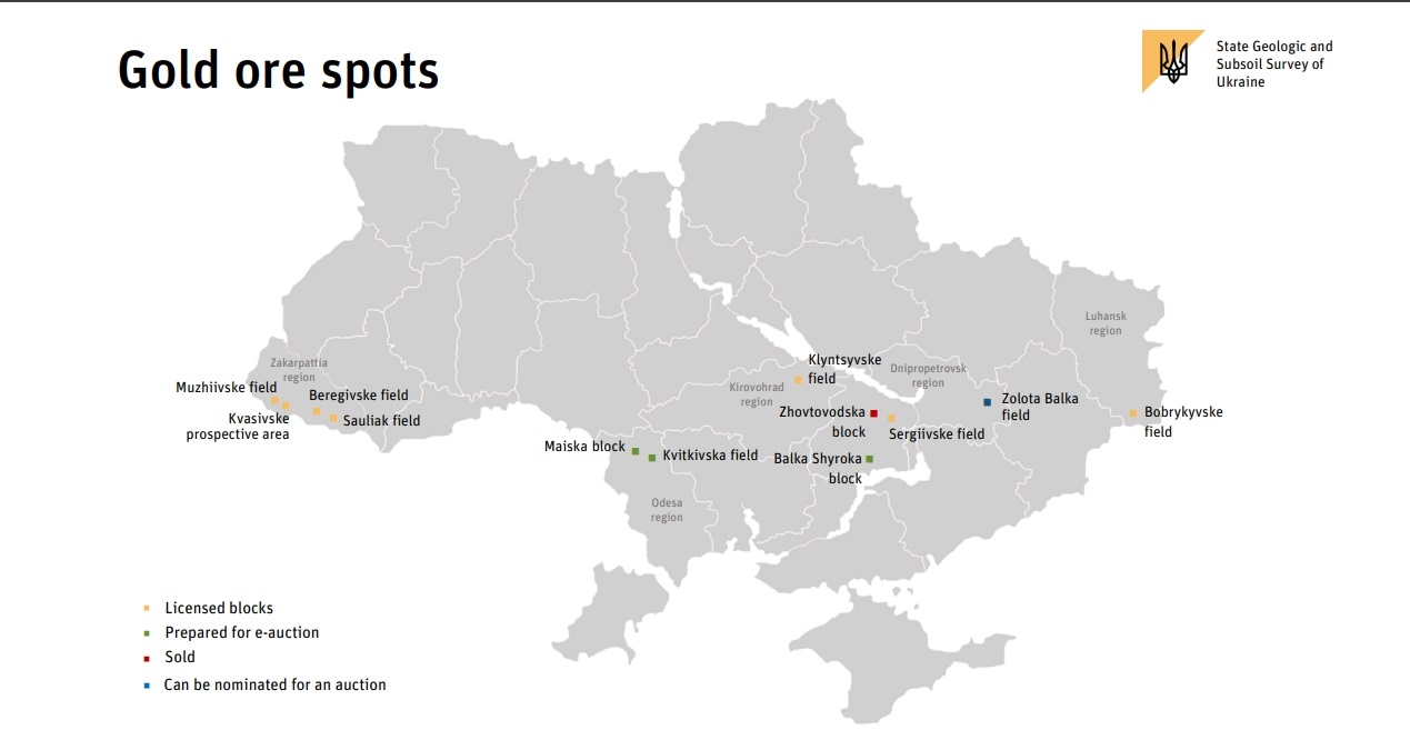 У надрах України містяться найрізноманітніші корисні копалини, зокрема й золото. Найбільше золотої руди зосереджено у центральних областях, на Донбасі та на Закарпатті.
