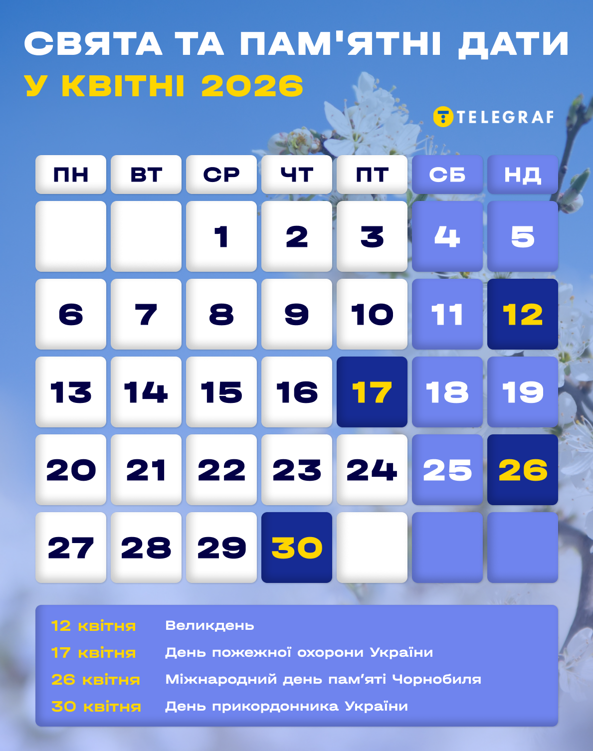 "Телеграф" підготував календар на квітень 2026 року. Дізнайтеся, скільки буде вихідних та робочих днів.