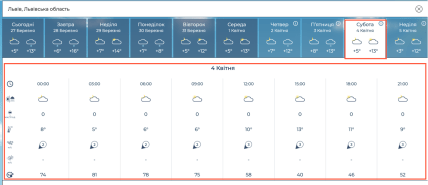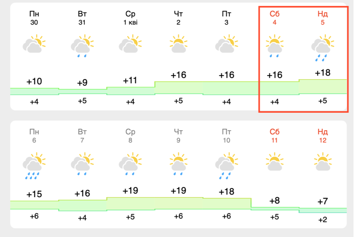 У суботу, 4 квітня, у Львові очікується невеликий дощ, проте день буде доволі теплим: повітря прогріється до +16°C вдень, а вночі температура опуститься до +4°C. На саму Вербну неділю, 5 квітня, стовпчики термометрів піднімуться ще вище — до +18°C вдень та +5°C вночі. Втім, попри високу температуру, ймовірність опадів, за даними цього ресурсу, залишатиметься високою протягом усього дня.